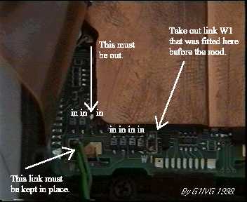 On my radio, originally there were two green link wires fitted to the PCB. The photo below shows my radio after modification. The wire link to remove is "W1". However leave link "W2" in place.