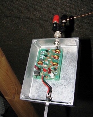 I have mounted the TX at the centre of a homebrew dipole in the loft of my house. To make the dipole I used a program that calculated the dimensions for a simple loaded dipole. My loft is just 8m long and I decided to make a loaded dipole that would hang horizontal and just fit the 8m available. Each leg of the dipole is made up of a 2m length of 0.5mm wire going into loading coil and then another 2m length to the tip of the dipole